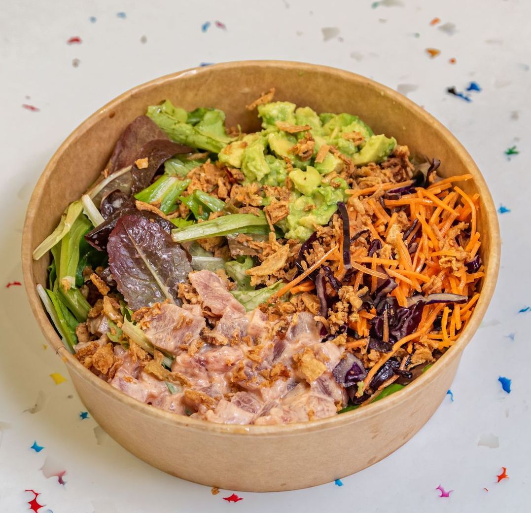 assortiment de salades, thon cru au soja, avocat, feta, chou rouge, carotte, oignons frits