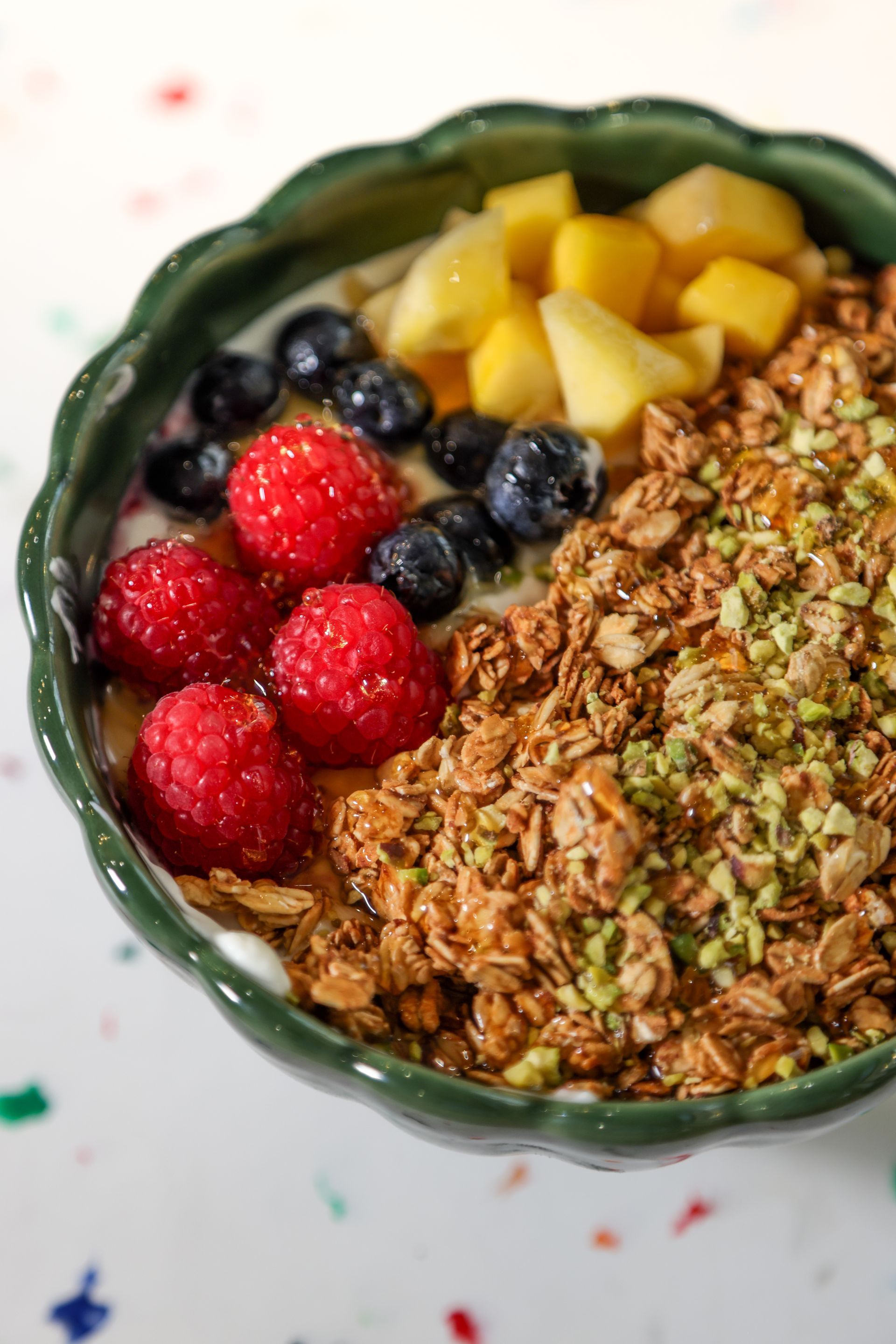 fromage blanc, fruits rouges, dés de mangue, muesli croquant, pistaches concassées et miel